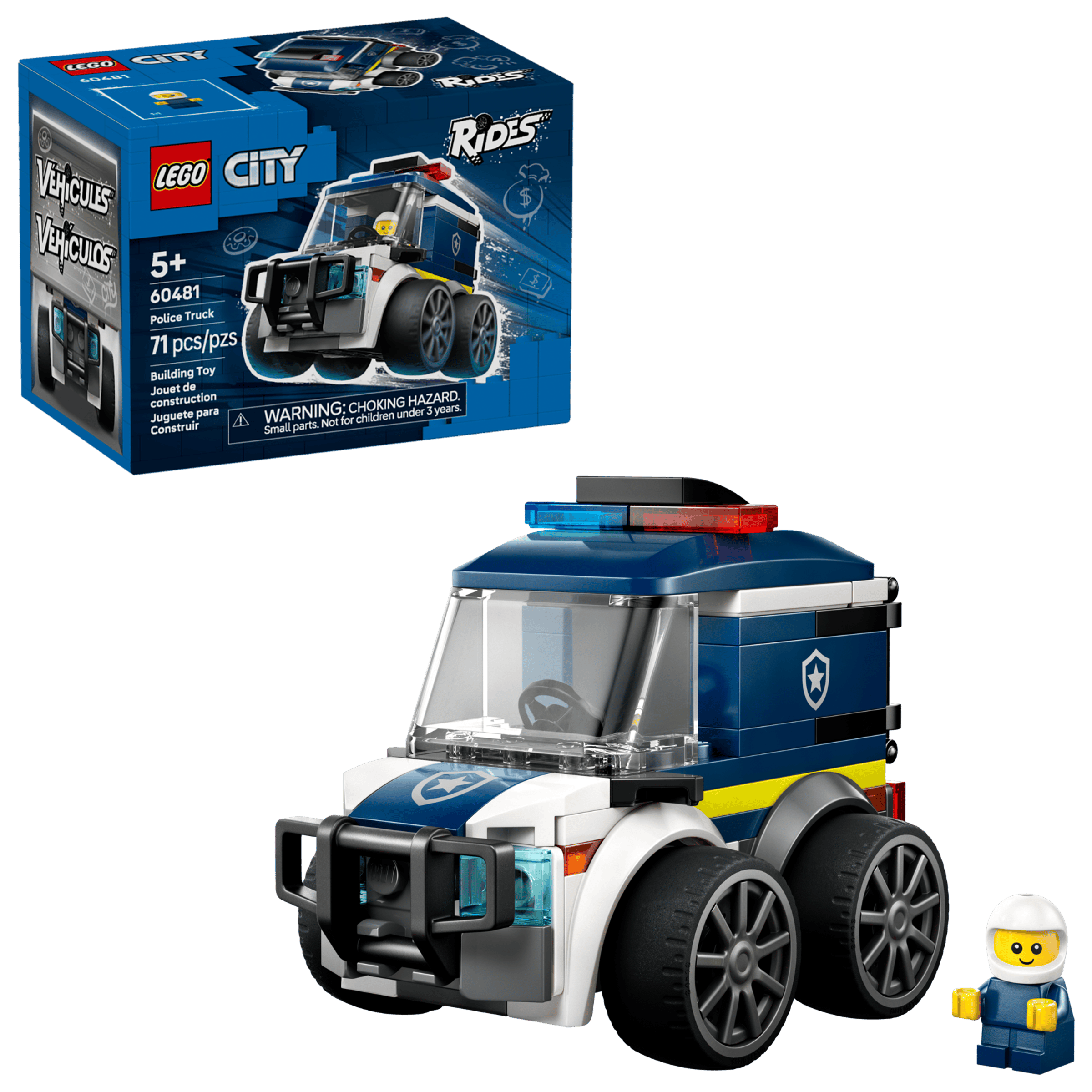 Unleash action-packed police adventures with the LEGO® City Rides – Police Truck (60481) mini building kit for kids aged 5 and up. This compact, buildable toy police truck with cool rims, low-profile rubber tires, a push bumper, prison bars and toy emergency lights offers young builders a fun way to explore the world of LEGO City. The set also includes a LEGO City Rides police officer junior minifigure that fits perfectly in the driver’s cab for hours of pretend play. Part of the LEGO City Rides collection, this easy-to-build police truck toy is perfect for young children and makes a great anytime surprise or birthday gift for boys, girls and kids who love toy cars and imaginative play. Add it to other LEGO City sets (sold separately) for more adventures. With this LEGO City Rides – Police Truck playset, kids can enjoy intuitive building with the LEGO Builder app, zooming and rotating with 3D instructions, while saving and tracking progress – all from the app. Set contains 71 pieces.