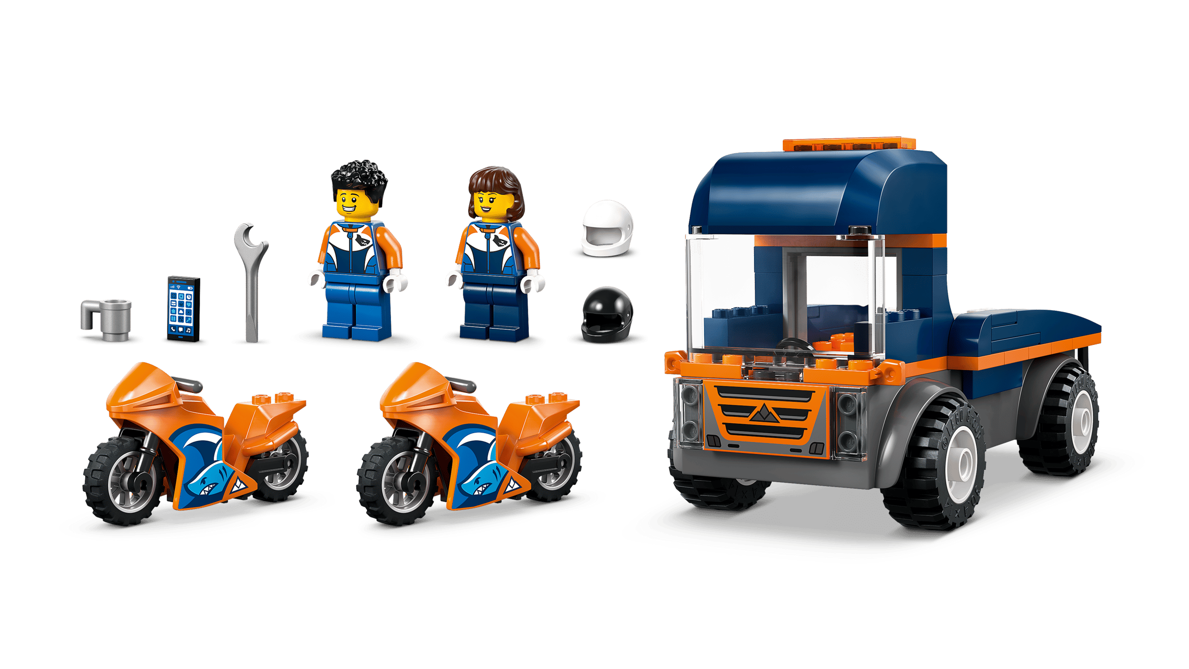 Introduce kids ages 4+ to a world of imaginative play with the LEGO® City Motorcycle Transporter (60491) toy building kit. This toy vehicles playset includes a flatbed truck toy with chunky rubber tires, 2 sporty motorcycle toys and 2 racer minifigures with helmets. Kids can load and unload the bikes using the ramp, play out epic motorcycle race action and seat a minifigure in the cab for fun on-the-road adventures. This easy-build toy playset includes a LEGO Starter Brick element, a simple pictorial guide and 3D instructions in the LEGO Builder app – a digital building companion with zoom and rotate tools that enable kids to visualize models from all angles as they build. This playset makes a fun treat or birthday gift for boys and girls who love racing toys, creative play and imaginative storytelling. Add these vehicle toys to other building sets (sold separately) from the LEGO City range for more exciting race action. Set contains 88 pieces.