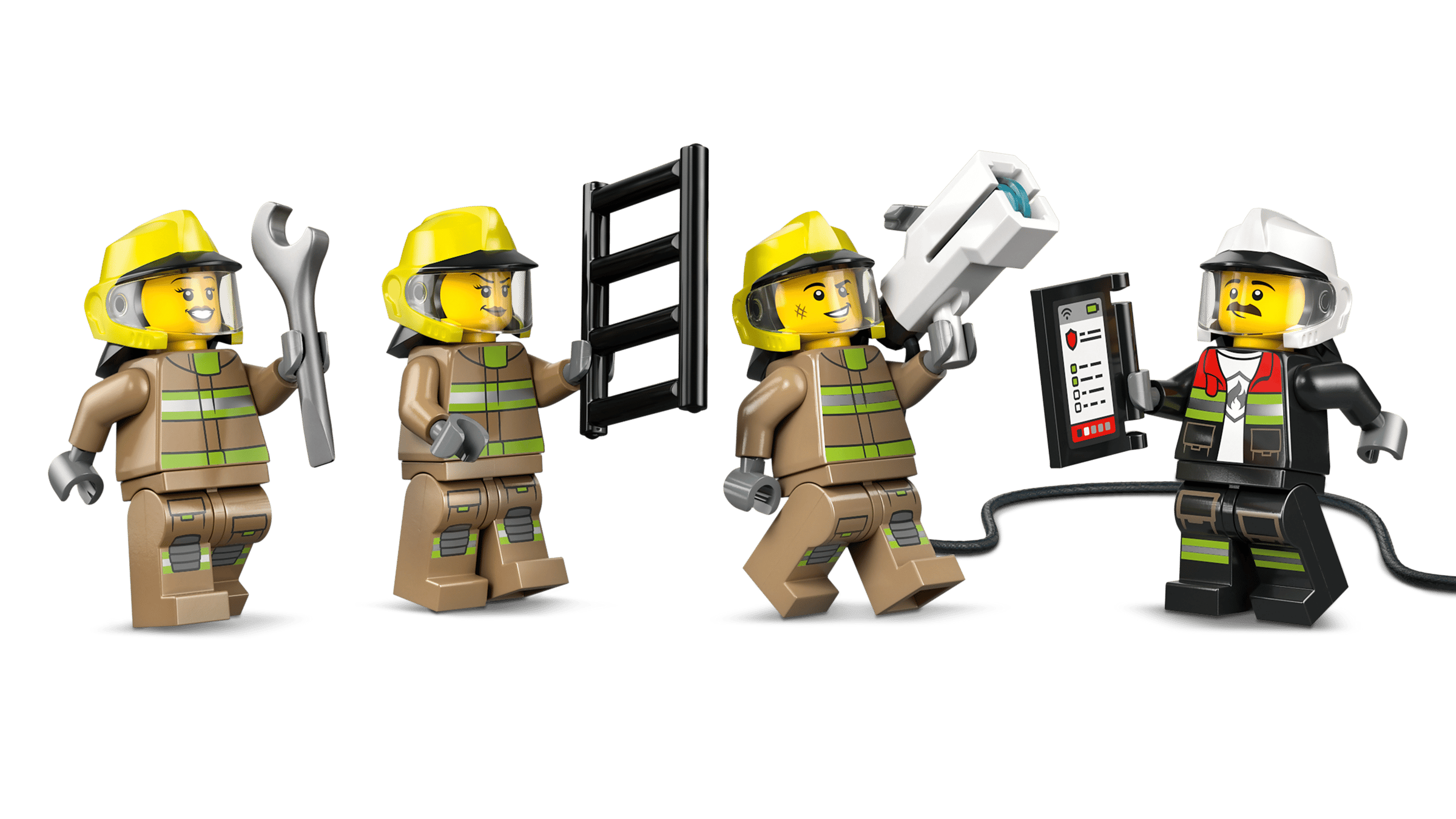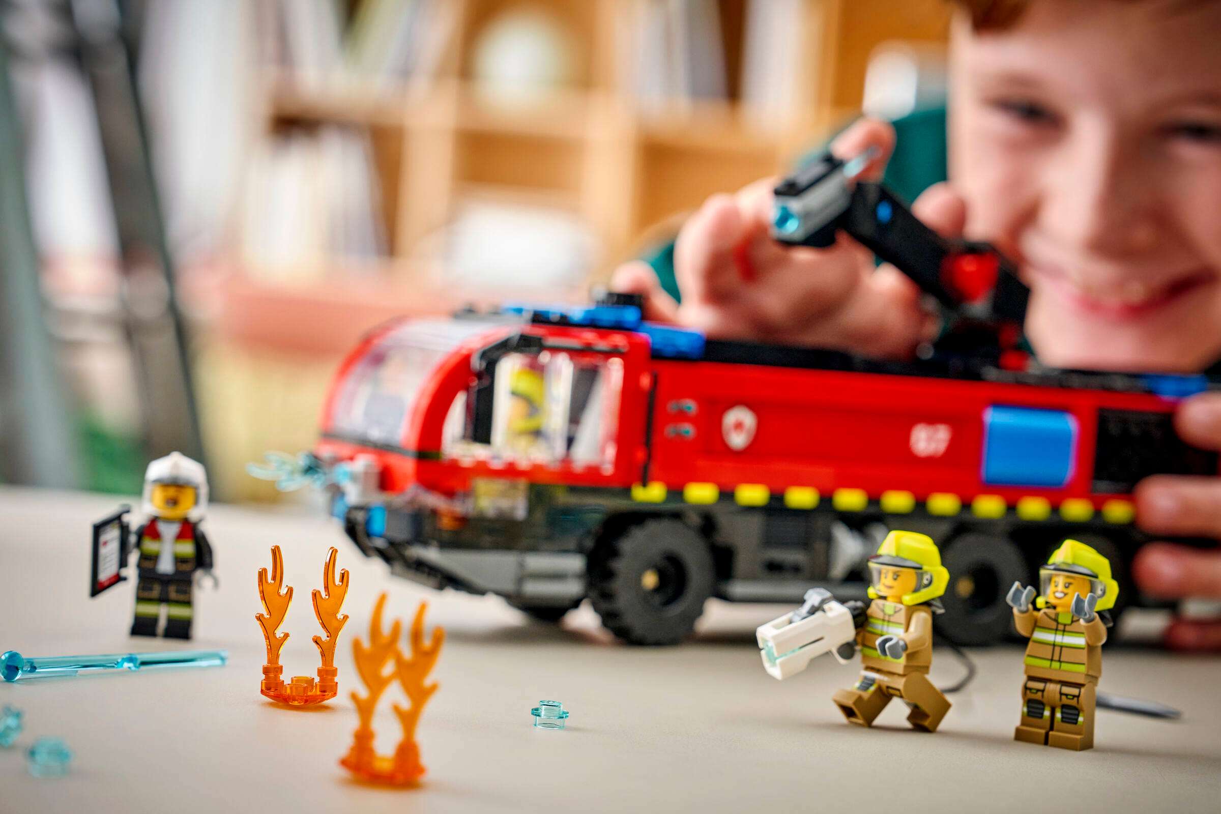 Mobilize the LEGO® City Airport Fire Truck (60499) for kids ages 7 and up. This realistic emergency vehicle toy features a 360° rooftop extinguisher, opening side equipment bays and tool storage compartments. Kids can turn a dial to steer the truck, launch water elements from the extinguisher and remove the engine for repairs. The toy truck comes with 8 chunky rubber tires and a detailed cockpit with seating for the 4 firefighter minifigures. Just add a sprinkle of imagination to ignite hours of heroic firefighting adventures. This toy truck building set makes a great birthday or any-day gift for kids with a passion for hands-on play. Use it with other LEGO City sets (sold separately) for even bigger adventures. Kids can build with confidence using the LEGO Builder app where they can zoom, rotate in 3D and track progress with easy-to-follow digital instructions. Set contains 691 pieces.