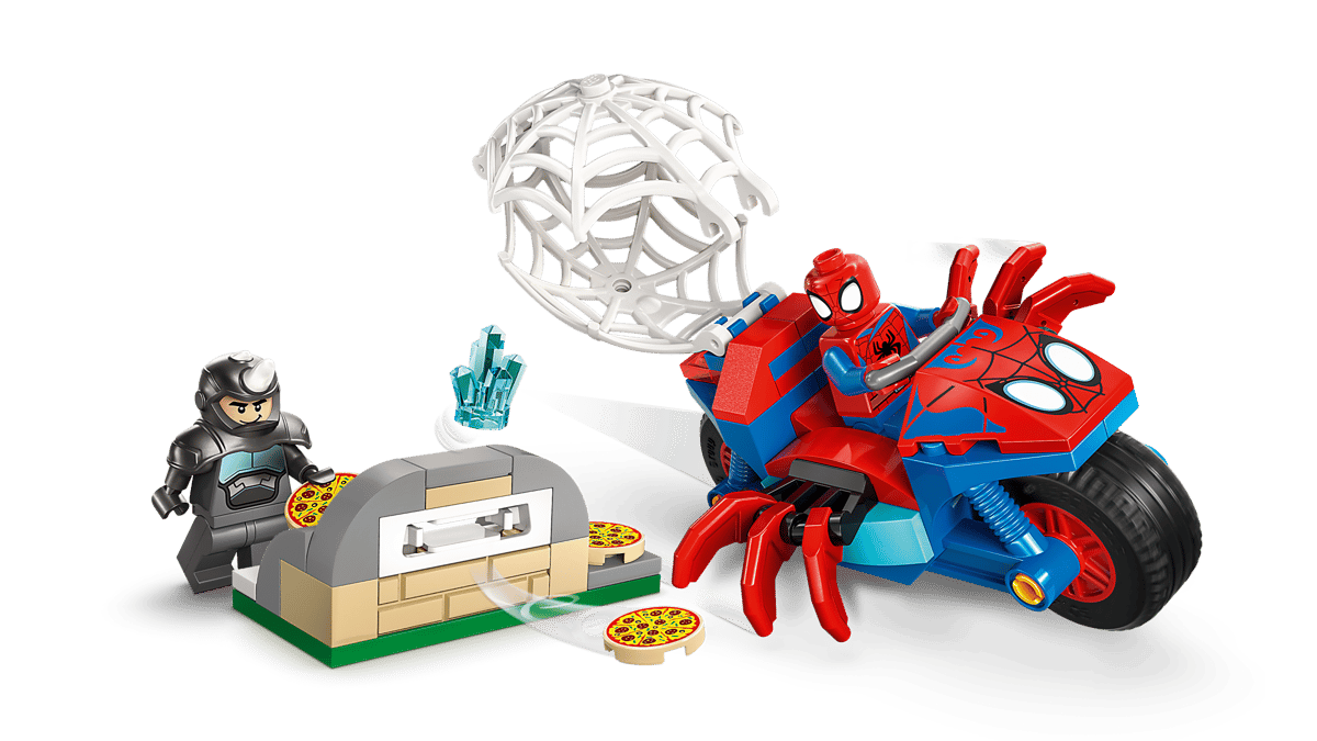 Put Super Hero action into kids’ hands with this Spidey on his Motorcycle vs. Rhino (11206) building toy for boys and girls ages 4 years old and up. With Spidey and Rhino minifigures and a spider-shaped motorcycle, this Spidey building set is a great way to help kids develop their creative skills. Kids help Spidey retrieve a stolen blue gem, dodge flying pizzas launched from Rhino’s pizza oven shooter, and capture Rhino in a giant spiderweb trap – which also fits onto the motorcycle. Designed with budding builders in mind, this building set is packed with details to inspire kids with endless imaginative play. It makes a great birthday or any-time gift for fans of Spidey And His Amazing Friends. It comes with colorful pictorial instructions, large Starter Bricks and separate bags containing 1 buildable model per bag to make construction fast and fun. With the LEGO® Builder app, kids can zoom, rotate in 3D and track progress with easy-to-follow digital instructions. Contains 61 pieces.