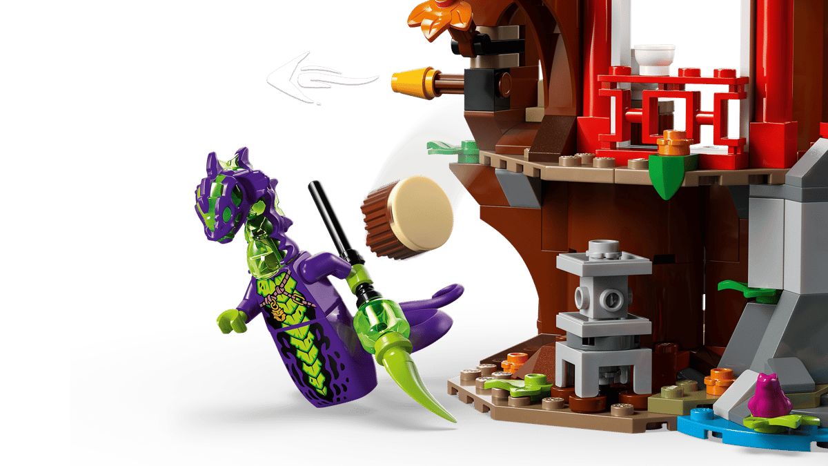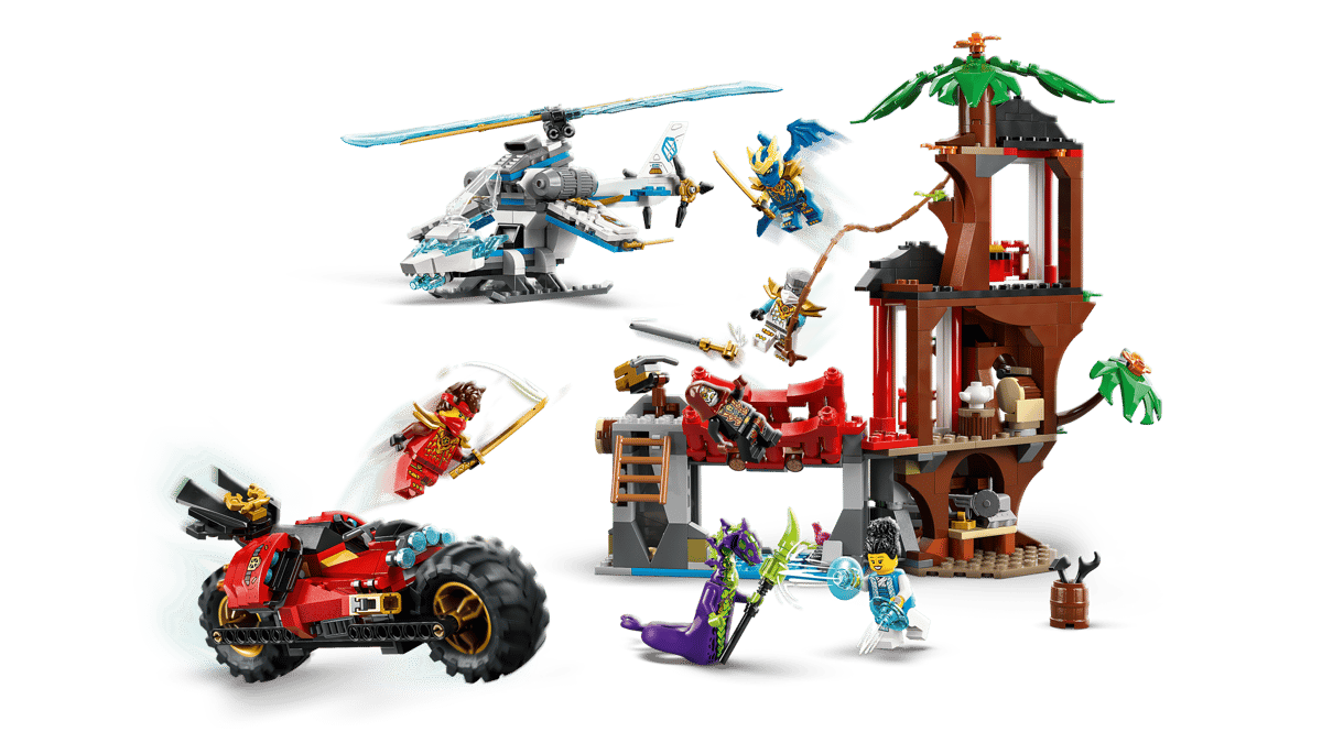 Boys and girls aged 7 plus have all they need to play out battle action with this Ninja Vehicle Tree House Battle (71857) building set, based on season 4 of the NINJAGO® Dragons Rising TV show. This fighting toy playset comes with a 3-storey tree house, a helicopter toy, a motorcycle toy and 6 minifigures. The tree house toy includes a workshop, a tearoom, a terrace, a swinging vine rope, a trap that releases a small rock, a rotating bridge and a stud shooter. Kids can enjoy unlimited role-play options with a motorcycle toy that has moving wheels, a saddle-cockpit and 2 stud shooters, or take to the sky with a helicopter toy that has an opening cockpit and rotating blades. The NINJAGO set features 6 minifigures: Kai, Zane, dragon form Jay and Euphrasia to play out battles against the Acid Monster and Loyalist. Kids can build the playset with confidence using the LEGO® Builder app – zoom, rotate in 3D and track progress with easy-to-follow digital instructions. Set contains 642 pieces.